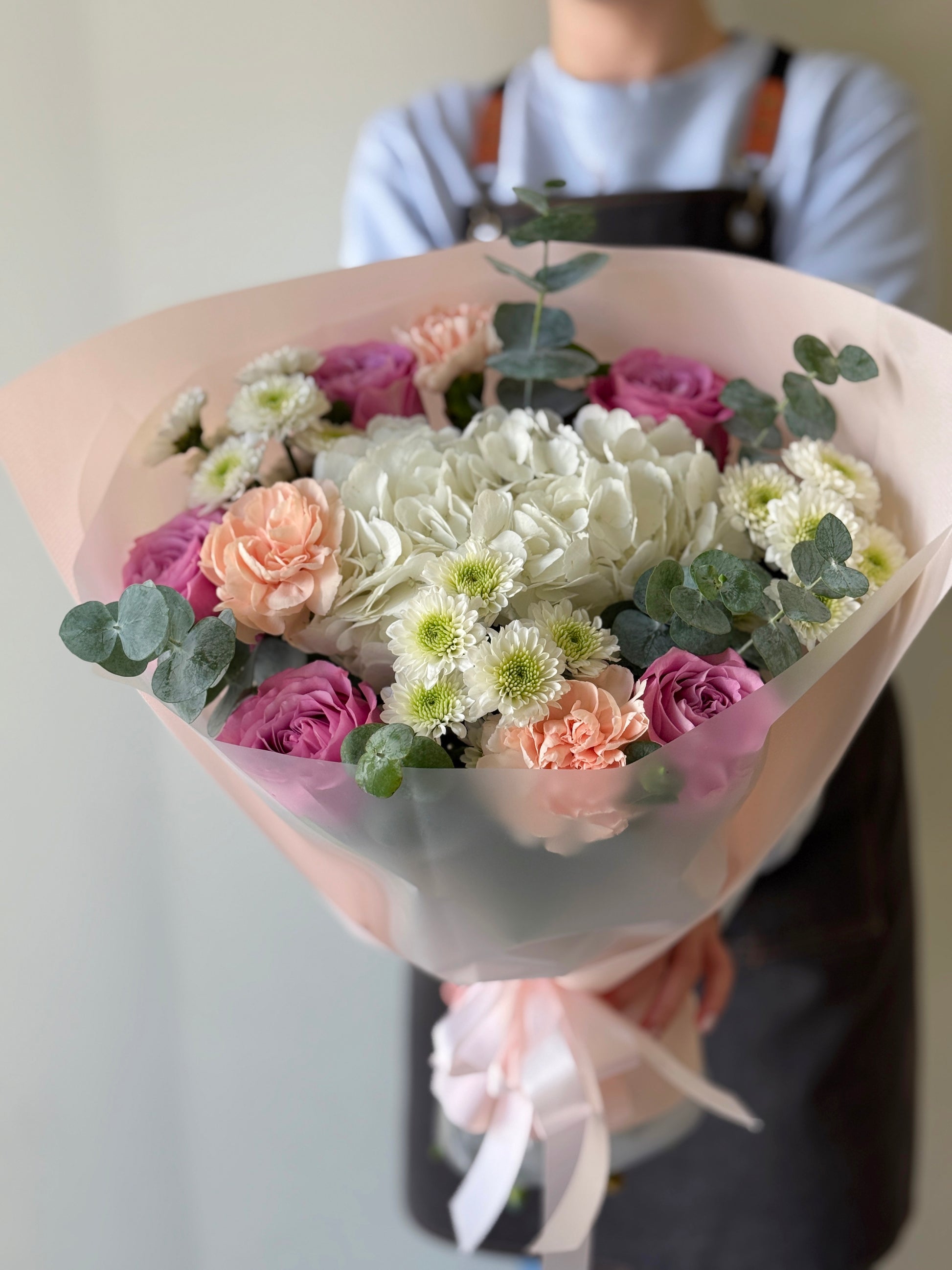 Delicate, elegant, and full of grace, Blush Serenity features a harmonious blend of soft white hydrangeas, peach-toned carnations, lavender roses, and creamy chrysanthemums, accented with sprigs of fresh eucalyptus. Wrapped in a soft blush-toned wrap and finished with a flowing satin ribbon, this bouquet is perfect for expressing love, gratitude, or celebrating life's sweet moments with timeless beauty.