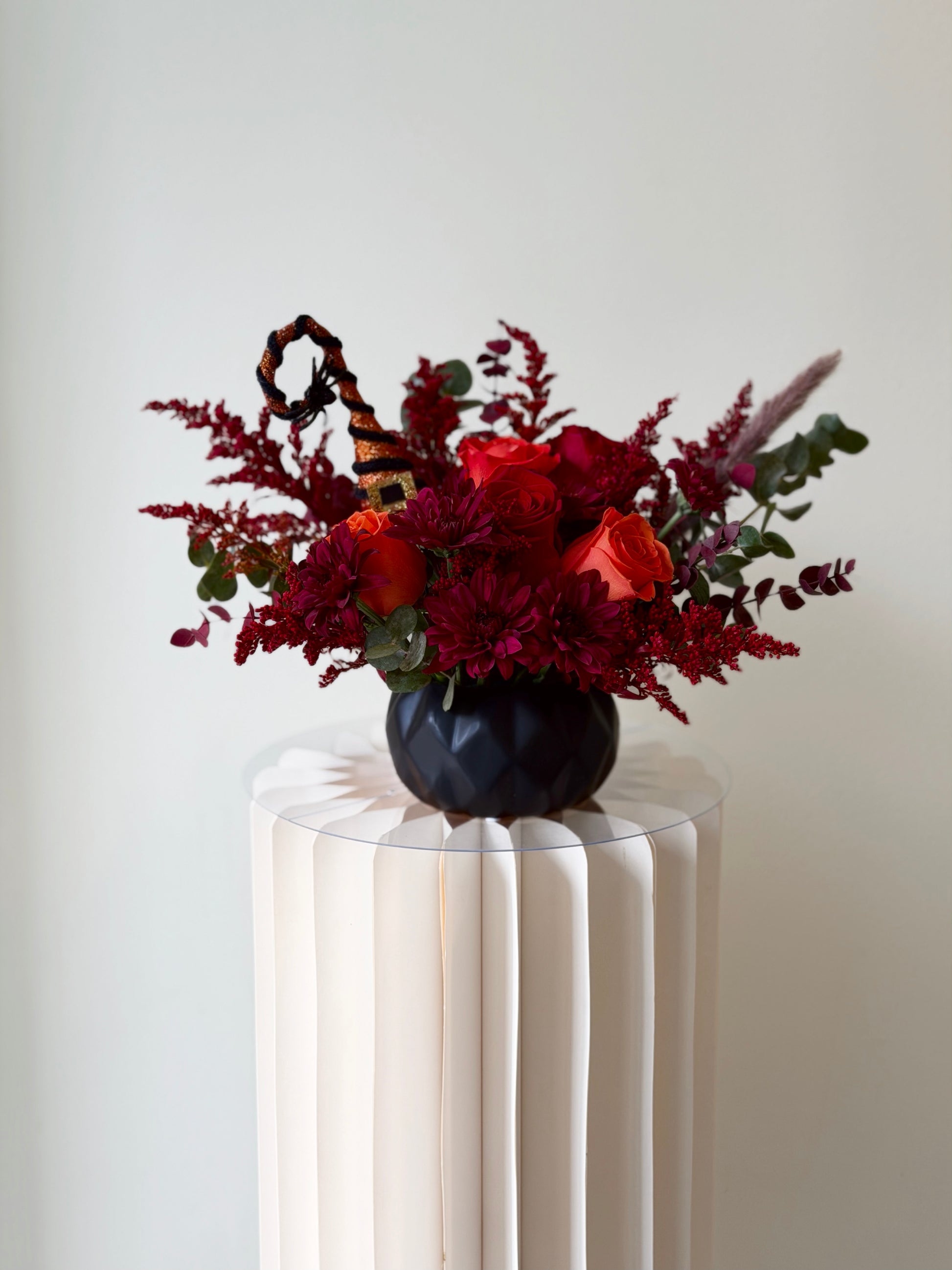 A rich and mysterious arrangement where fiery red roses meet deep wine-toned blooms, creating an aura of magic and allure. Nestled in a modern black vase, Crimson Spell adds a touch of drama and elegance — perfect for fall evenings, romantic gestures, or stylish seasonal décor.