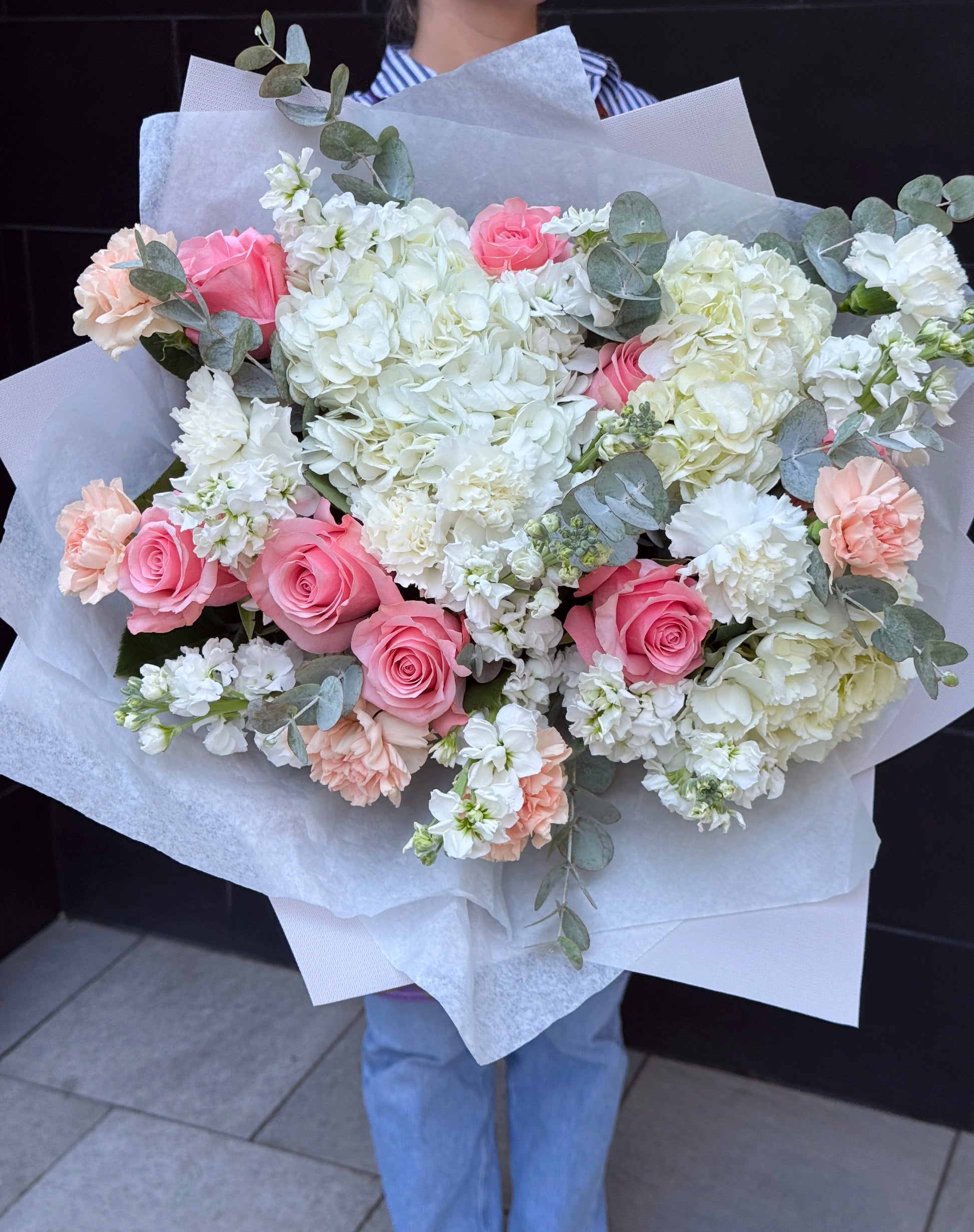 Cotton Kiss — a bouquet as soft as a cloud and as tender as a touch.Blush-pink roses and airy hydrangeas blend effortlessly with the cool elegance of blue eucalyptus, creating a composition that feels like a quiet breath of morning light.This bouquet whispers calm, love, and grace — perfect for gentle confessions, heartfelt thanks, or simply to brighten someone’s day with a moment of beauty.